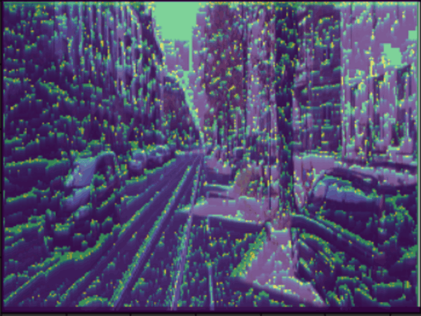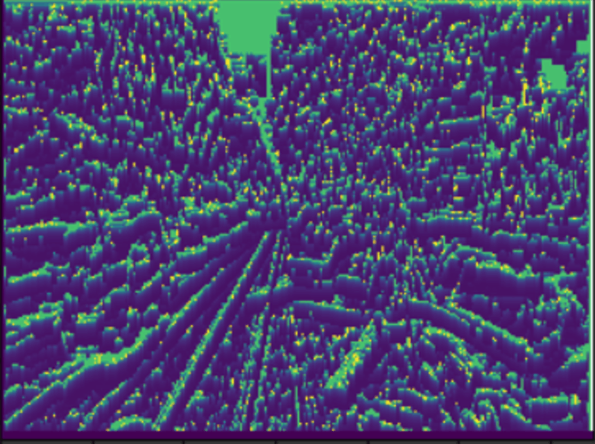 The observed ‘streaks’ were assumed to be a result of a specific malfunction of the neural network: it seemed as though there were certain pixels that were assigned a very high similarity score independently from the pixels they were compared with. This could indicate that one pixel (e.g. pixel 10/20 on the right image) would obtain a very high similarity score with all the pixels from the left image - meaning that 10/20, 11/20, 12/20 … 30/20 (up until 10/20 is outside of the search area, in this case, a search area of width 20) would all be matched up with 10/20 from the right image. Since the distance was found based on the pixel shift, and the program iterates through the image, the assigned distance values would gradually increase as the pixel shift was changing. This resulted in the fading ‘streaks’ seen in Figure 14.